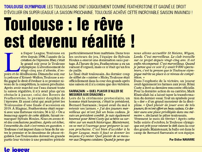 panz a écrit:ca va etre chaud le derby dragons-toulouse l'an prochain. c'est excellent pour la promotion du rugby a 13. moi je me regale de regarder, pas de meles, touches, arrets interminables, et les placages au dessus de la ceinture sont autorises!