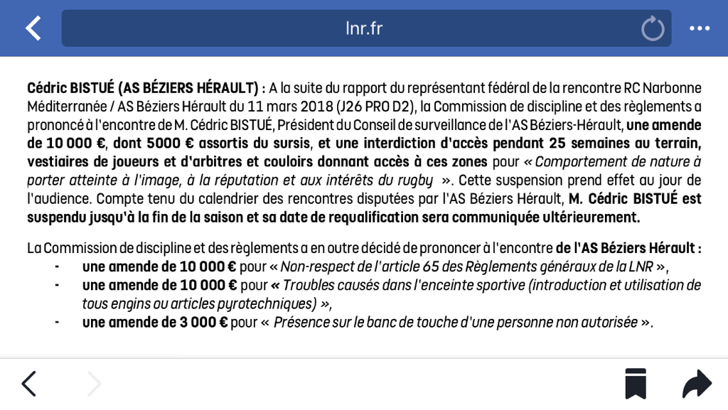 Et Narbonne alors ? Rien ? aucune sanction ? Ils ne sont pas responsables de la sécurité de leur stade ? C'est nouveau ça !