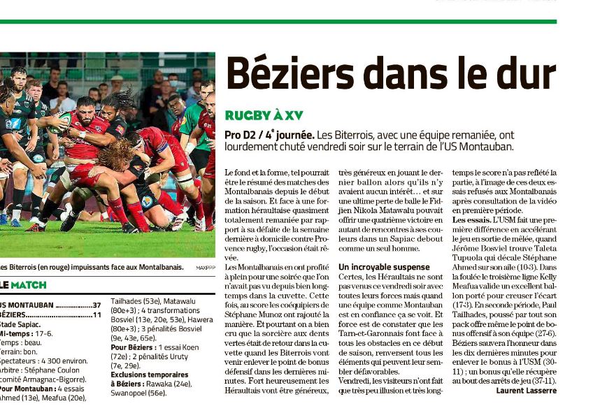 joug 2 a écrit:quant à Béziers ira à Montauban affronter l'équipe s'un certain D Gérard , un déplacement très dur en perspective, cette équipe à failli tomber dans le piège Narbonnais cela doit souder ce genre de match