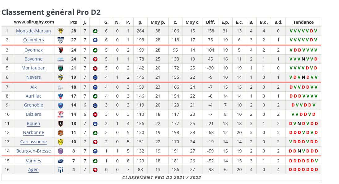 vendredi 15 octobre 2021 Mt. Marsan 45 Rouen 8 Vannes 46 Agen 3 Narbonne 30 Nevers 33 Aix 23 -bourg en Bresse 17 Oyonnax 56 Montauban 6 Aurillac 30 Carcassonne 26 Grenoble 19 Béziers 21 Les cartons de Mont de Marsan et Vannes , Agen au plus mal , Oyonnax en patron , Narbonne s'accroche , Béziers gagne enfin à Grenoble qui doute voilà donc le bilan de cette journée