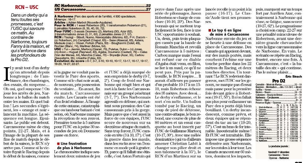 CLUB_XV a écrit:Rugby-ProD2, Julien SERON (Narbonne) après le derby : « On part à moins 7 au bout d’une minute … compliqué ! » (J14)
