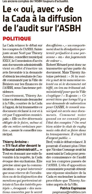 La Cada relance le débat sur les comptes de l’ASBH. Saisie juste avant Noël par Thierry Antoine, conseiller municipal EELV, la Commission d’accès aux documents administratifs vient en effet d’émettre un avis favorable à la demande d’obtenir les résultats de l’audit commandé par la Ville de Béziers sur les finances de l’ASBH, sous l’ancienne présidence.