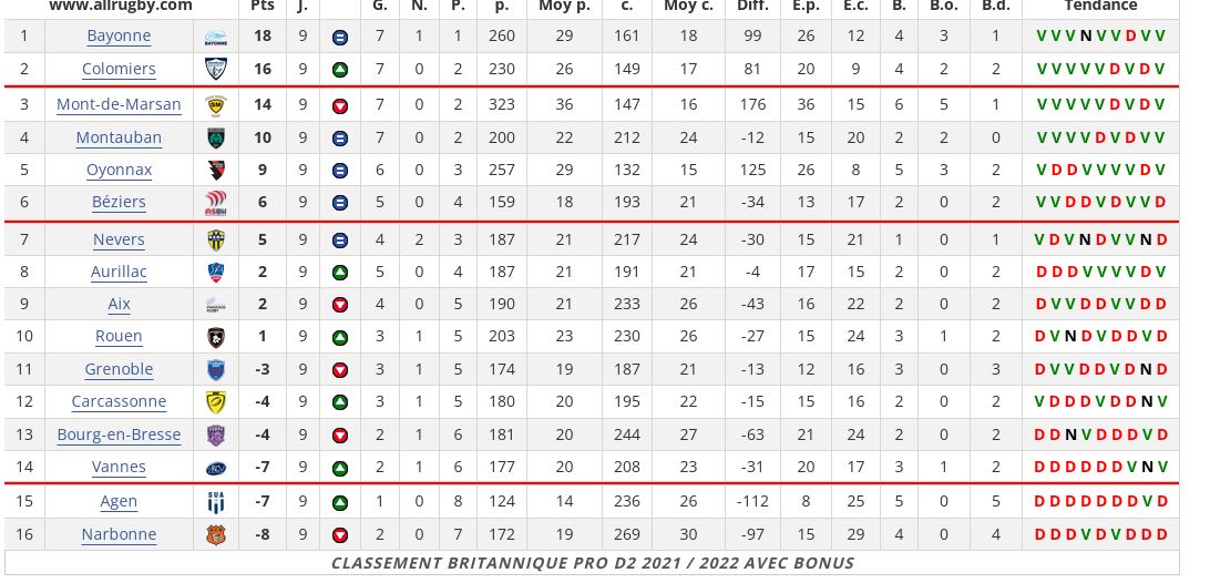 Une journée qui s'annonce intéressante avec de nombreux derbys , hier Agen Montauban , Bayonne Mt de Marsan , Bourg en Bresse Oyonnax et évidement Béziers Narbonne . A surveiller le classement qui bougera certainement à commencer par Agen qui sort de la zone rouge après sa victoire hier peut être une Remontada ? D'autant plus que que des renforts sont prévues en haute Garonne ;-)